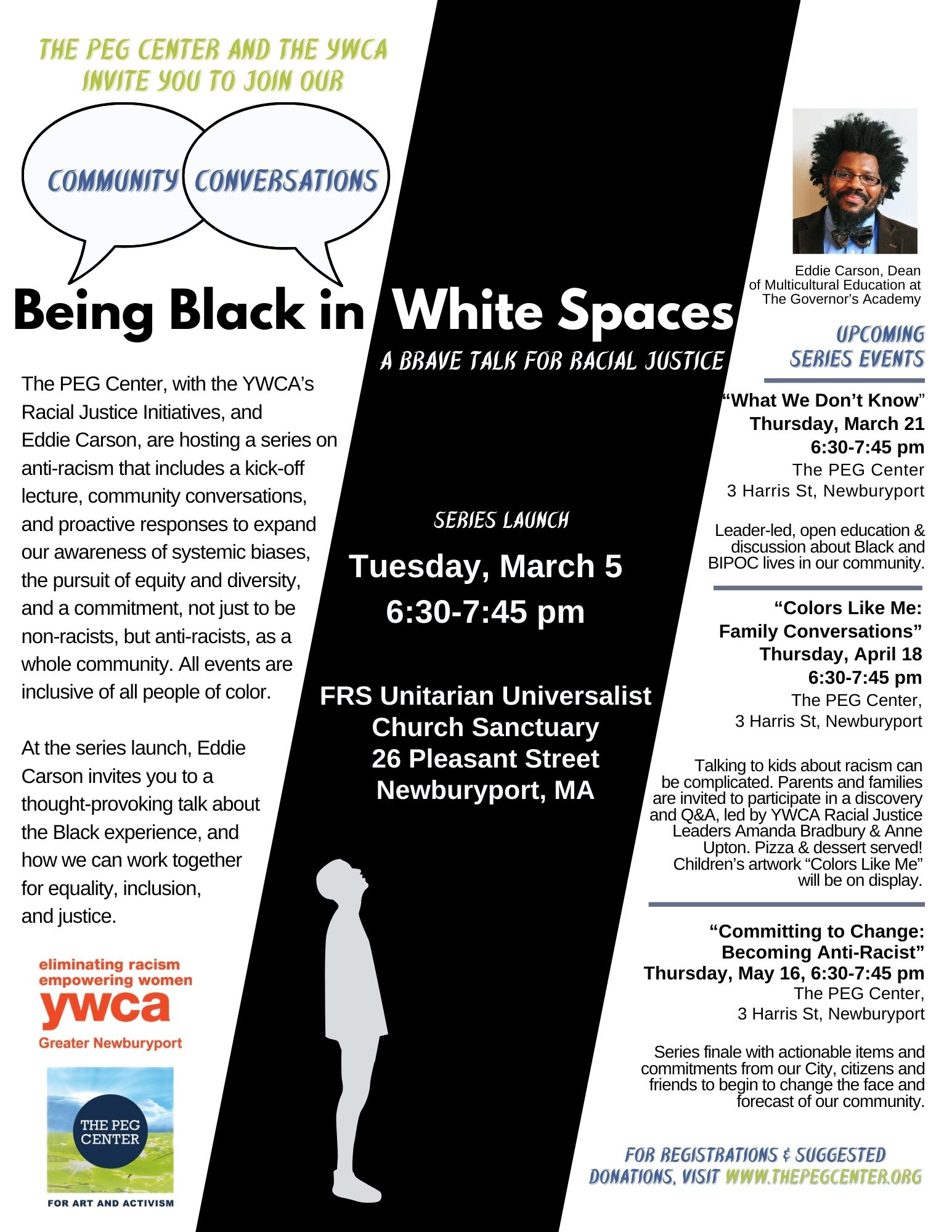 The PEG Center, in collaboration with the YWCA’S Racial Justice Initiatives, and Eddie Carson, have created a month’s-long program on anti-racism that will take our community through a kick-off lecture, community conversations, and proactive responses and actions, all in service to expanding our community’s awareness of systemic biases, the pursuit of equity and diversity, and a commitment, not just to be non-racists, but anti-racists, as a whole community.